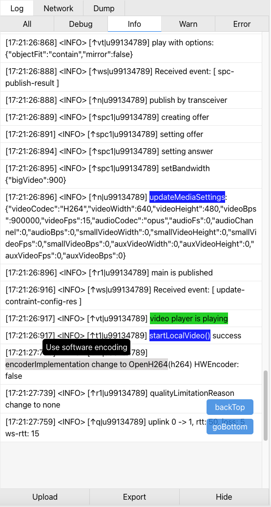 - Dump video: Dump the local upstream video stream or remote downstream video stream into a .h264format video file