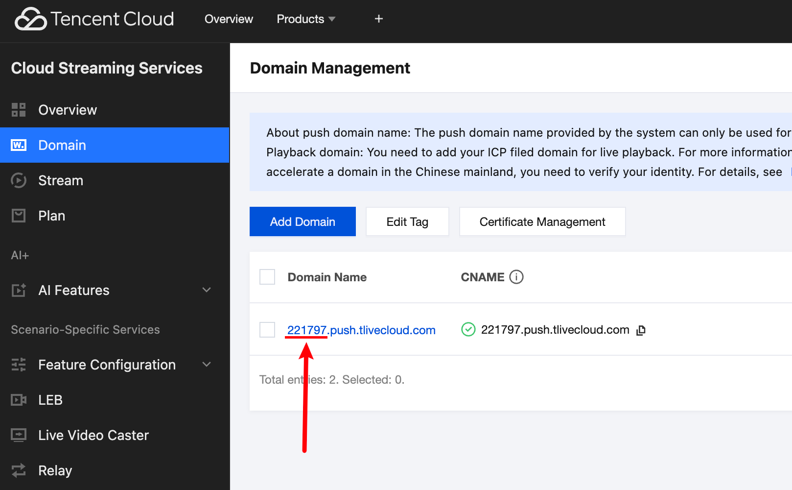 In TRTC Console - Advanced Features, find your push domain (format: xxxxx.push.tlivecloud.com):