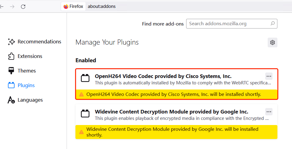 - Use TRTC.checkSystemRequirements API, if it detects that H264 codec is not supported in Firefox, guide the user to open the address: about:addonsin Firefox and check the installation of OpenH264 in thePlugin. Wait for the installation to complete before making the call.