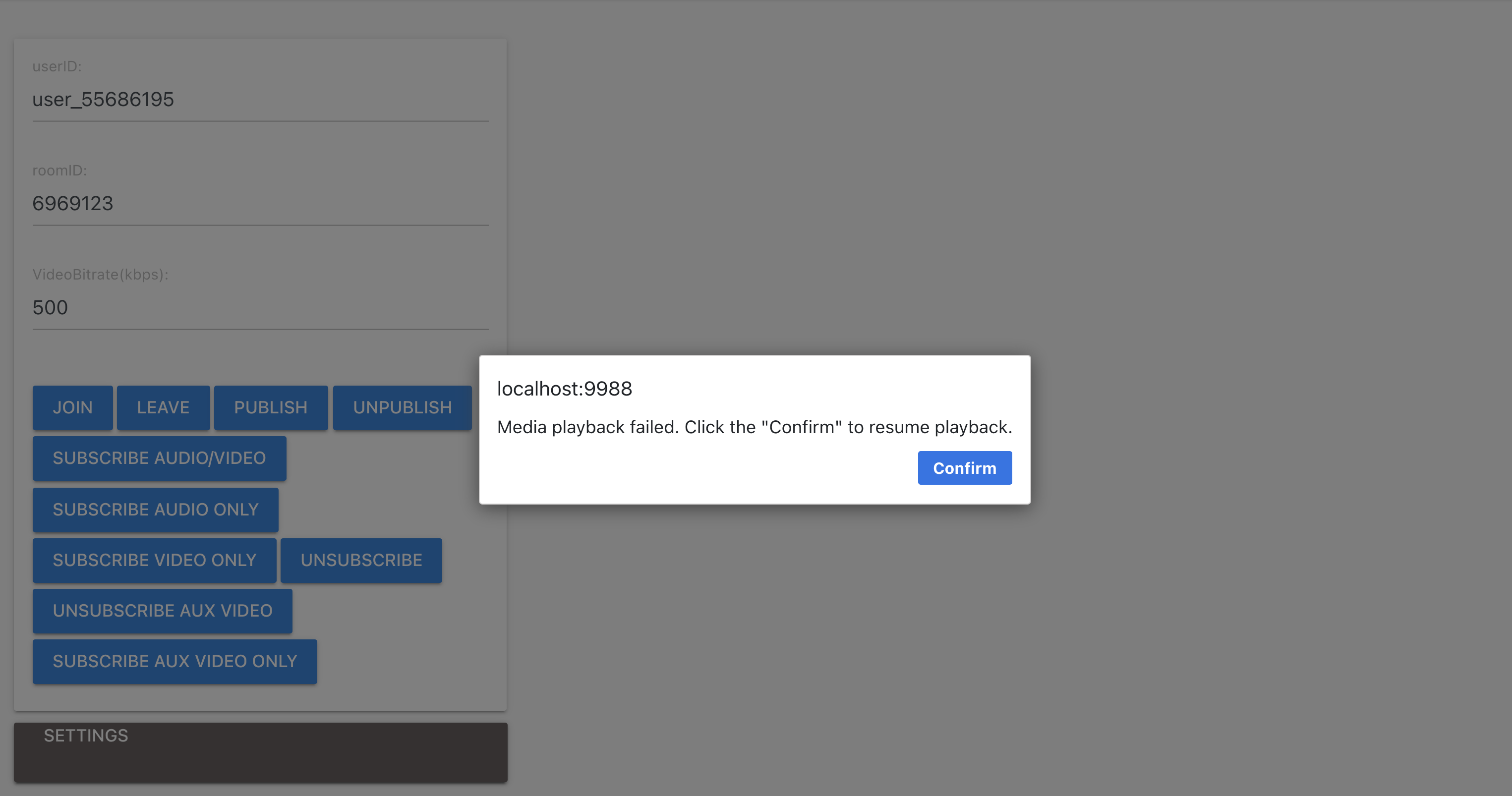 Listen to the error PLAY_NOT_ALLOWED. When the error fired, show a dialog to guide user interact with the page. If interaction occurs, call Stream.resume to resume the playback. // You can catch error like this. try { await stream.play('remote'); } catch(error) { if (error.getCode() === 0x4043) { // PLAY_NOT_ALLOWED. Guide user to interact with page, call stream.resume() in the callback function of the user click event // stream.resume() } } // On v4.8.4 or above, we recommend you use this way to catch error. stream.on('error', error => { if (error.getCode() === 0x4043) { // PLAY_NOT_ALLOWED. Guide user to interact with page, call stream.resume() in the callback function of the user click event // stream.resume() } }) stream.play('remote').catch(error => {});