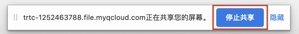 停止屏幕分享 // 取消推流 await clientA.unpublish(shareStream); // 停止采集屏幕分享 shareStream.close();另外用户还可能会通过浏览器自带的按钮停止屏幕分享,因此屏幕分享流需要监听屏幕分享停止事件,并进行相应的处理。   // 屏幕分享流监听屏幕分享停止事件 shareStream.on('screen-sharing-stopped', async event => { // 取消推流 await clientA.unpublish(shareStream); // 停止采集屏幕分享 shareStream.close(); });