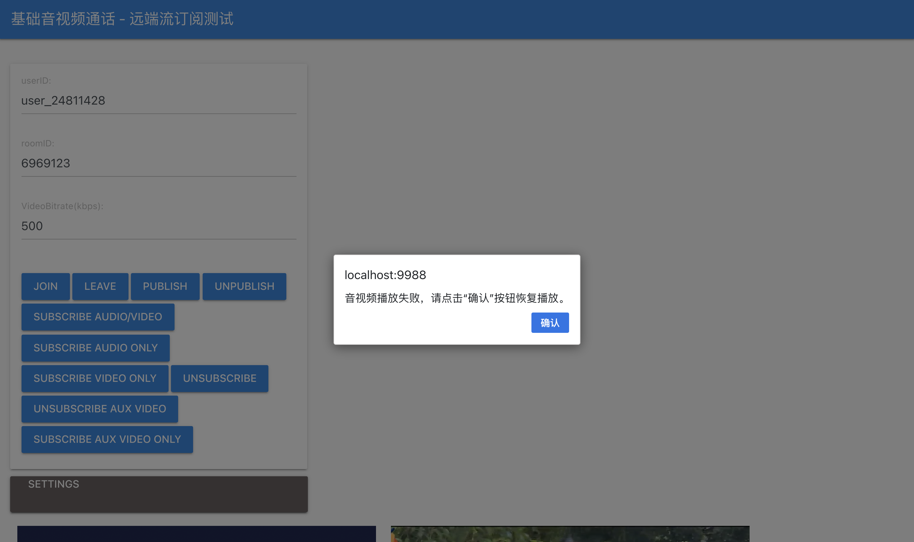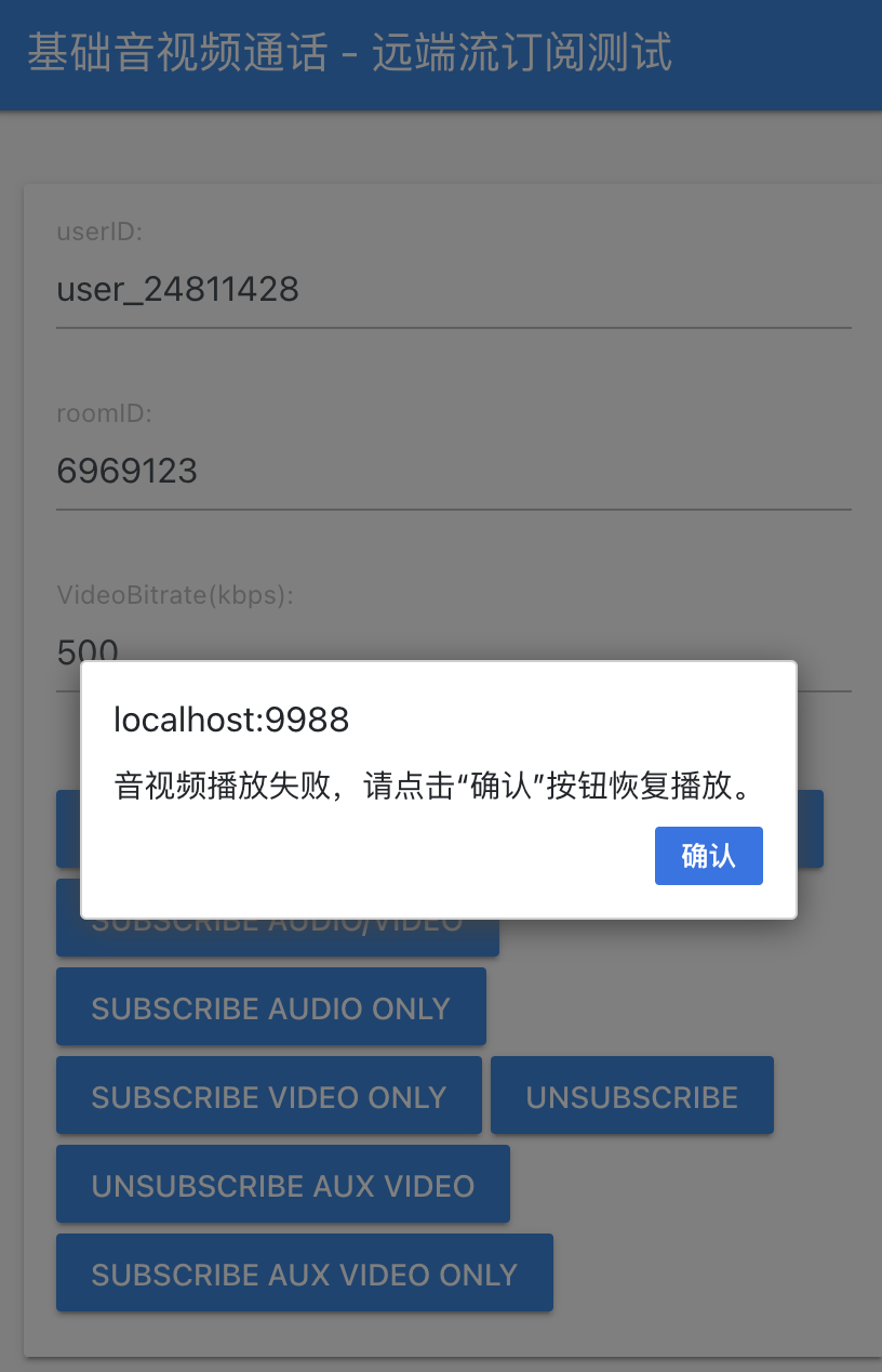 在产品设计中,提前引导用户与页面产生交互(例如点击、触摸等),当产生交互后再调用 Stream.play 播放音视频。 大部分的浏览器在用户交互之后就放开了 AutoPlay 限制,该步骤可有效避免出现自动播放失败的错误。但是,由于各浏览器厂商对于自动播放策略的实现存在差异,即使提前引导用户与页面产生交互,也不能确保不会出现自动播放失败错误。因此第二步的处理是必须要保留的。 例如:在 iOS 微信浏览器及其小程序的 webview 中,页面首次播放远端流时,必须在用户点击事件的回调函数中调用播放接口,否则播放会失败。倘若您在用户点击事件的回调中,使用了 setTimeout 等接口来异步调用播放接口,亦会出现自动播放失败错误。